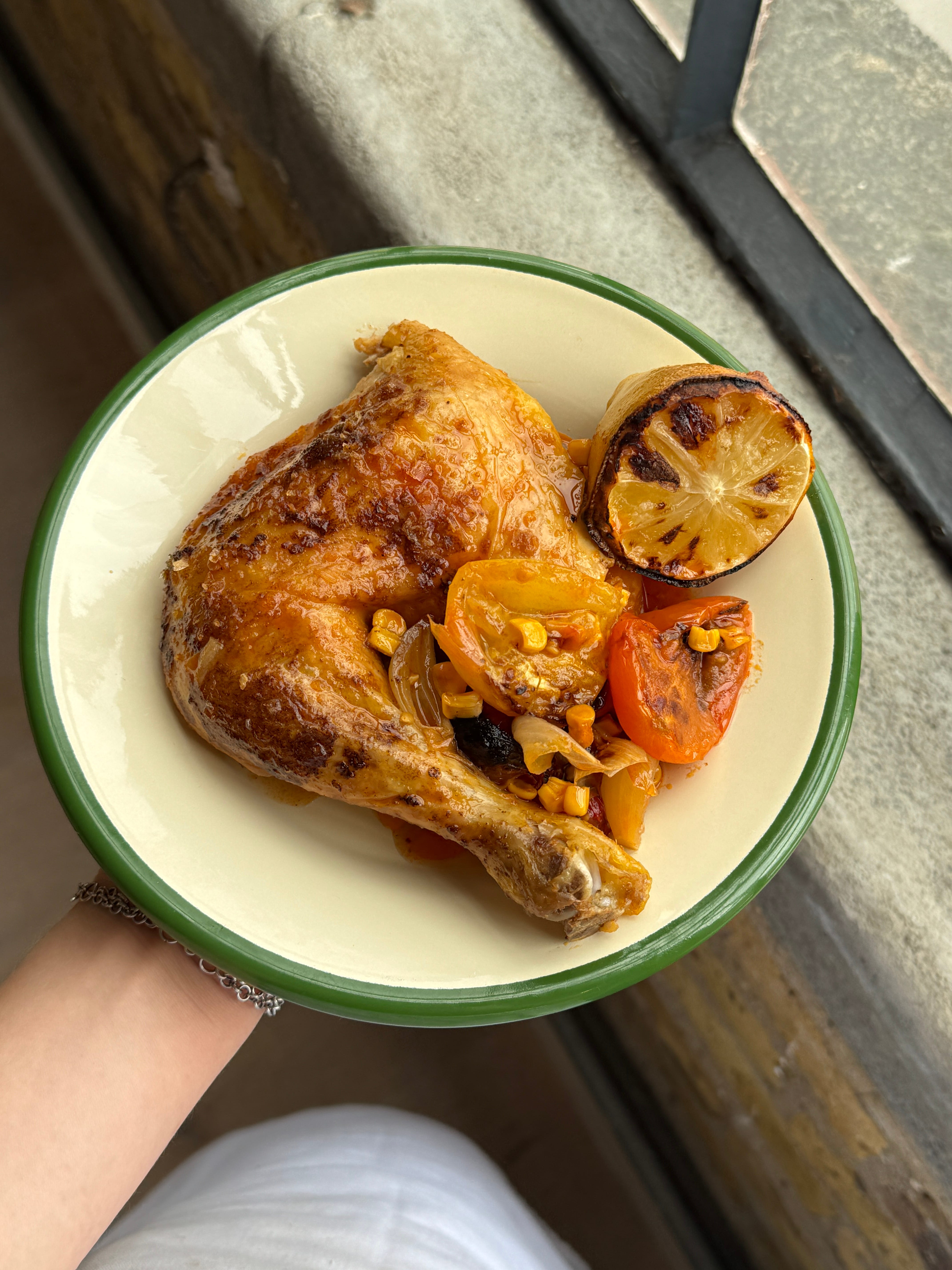 golden chicken, browned butter, glossy corn and jammy tomatoes