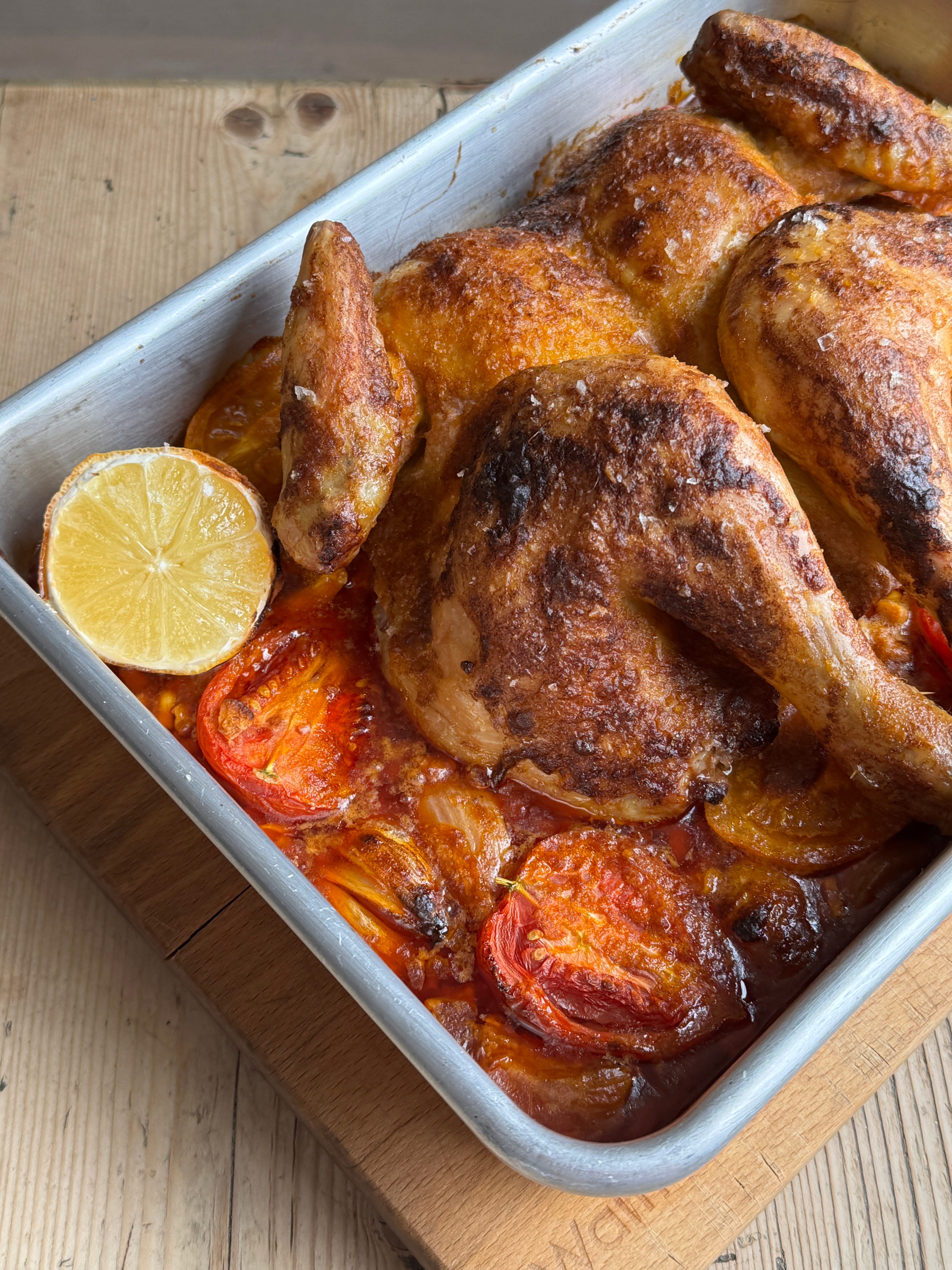 This is a spatchcocked chicken recipe and it’s intentionally so for a few reasons, for one it cooks quicker, making it even less hassle, the other is that it cooks more evenly and I think you get a juicier breast / leg / thigh situation AND crispier skin as there is more surface area exposed directly to the heat - and who can argue with more crispy skin, maybe the best part of a roast chicken?! If spatchcocking a chicken scares you or feels too high maintenance, do what I do, get your chicken from a butcher and ask them to do it for you, just make sure to keep the spine and giblets for stock. If you want to do it yourself, it’s really very simple and satisfying, full directions in the recipe below.