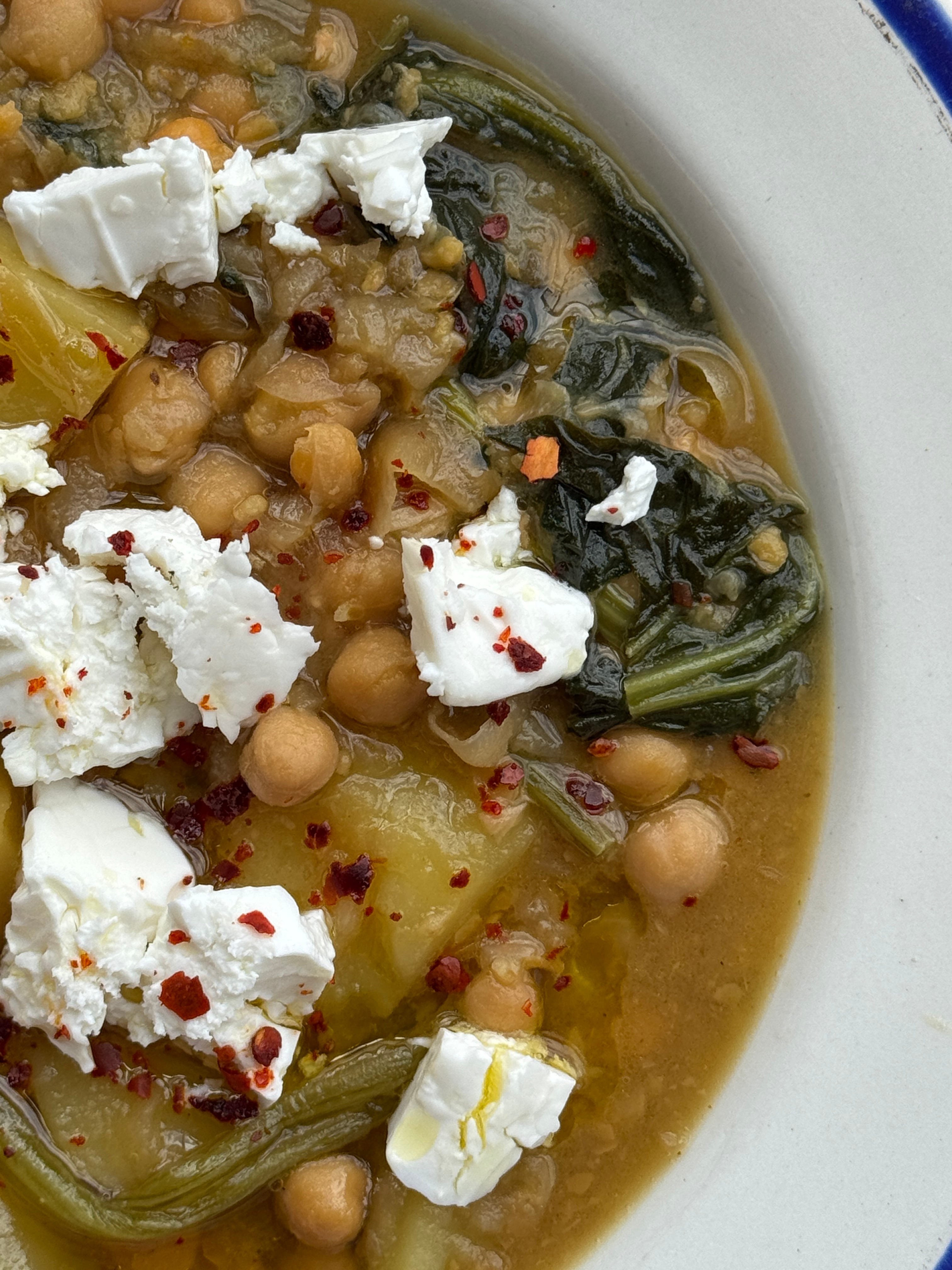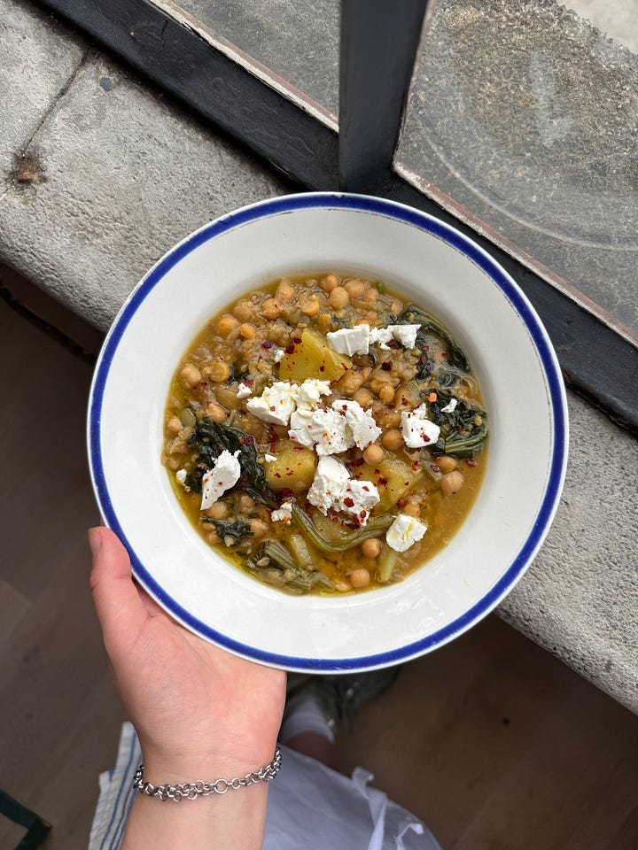 There’s far more to this stew than just chickpeas, like all good stews it has chunks of perfectly tender potato, there is wilted greens, which would be Horta in Greece but back home became spinach. There are wonderfully caramelised onions and garlic folded through, giving it a depth of flavour not often found in vegetarian stews. It’s topped with sharp, cold, salty chunks of feta, a pinch of Aleppo pepper and lashings of the best olive oil you can find.