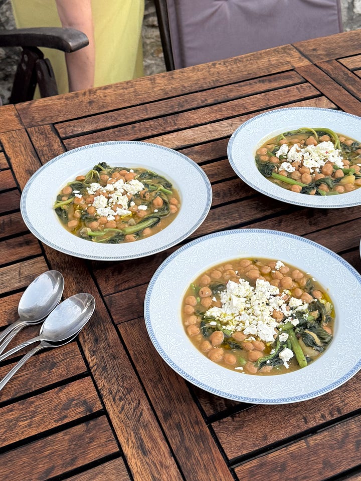 Let me rewind to a very brief but lovely holiday I took in Greece at the beginning of June. In the run up to the trip I had been obsessively following Chloe Walsh’s travels around Greece and I kept seeing plate upon plate of braised chickpeas, almost translucent, pillowy soft and bathed in oil. I was hell bent on eating them as soon as I got to Paxos, but they just didn’t appear on any of the menus in the restaurants we ate at, perhaps it’s a regional thing, I’m not sure, but I was slightly gutted. Lucky for me, I was on holiday with Stacey O'Gorman and she was on the exact same wave length. Having been there a bit longer than me and failing to find the sacred chickpeas at a restaurant, she had bought a bag of dried chickpeas and planned to cook them - I’m sure you can see why Stacey and I are tight friends. I was thrilled she had thought this far ahead, if we couldn’t find them on a restaurant menu, we would attempt to make them ourselves. I went to the source and messaged Chloe to get the low down of what was going on to make these chickpeas so good and she told me the secret is a lot of caramelised onions, taken pretty dark and folded through the stew half way through cooking - genius.
