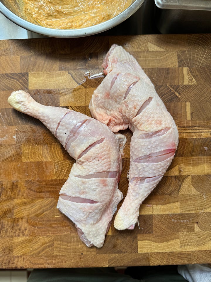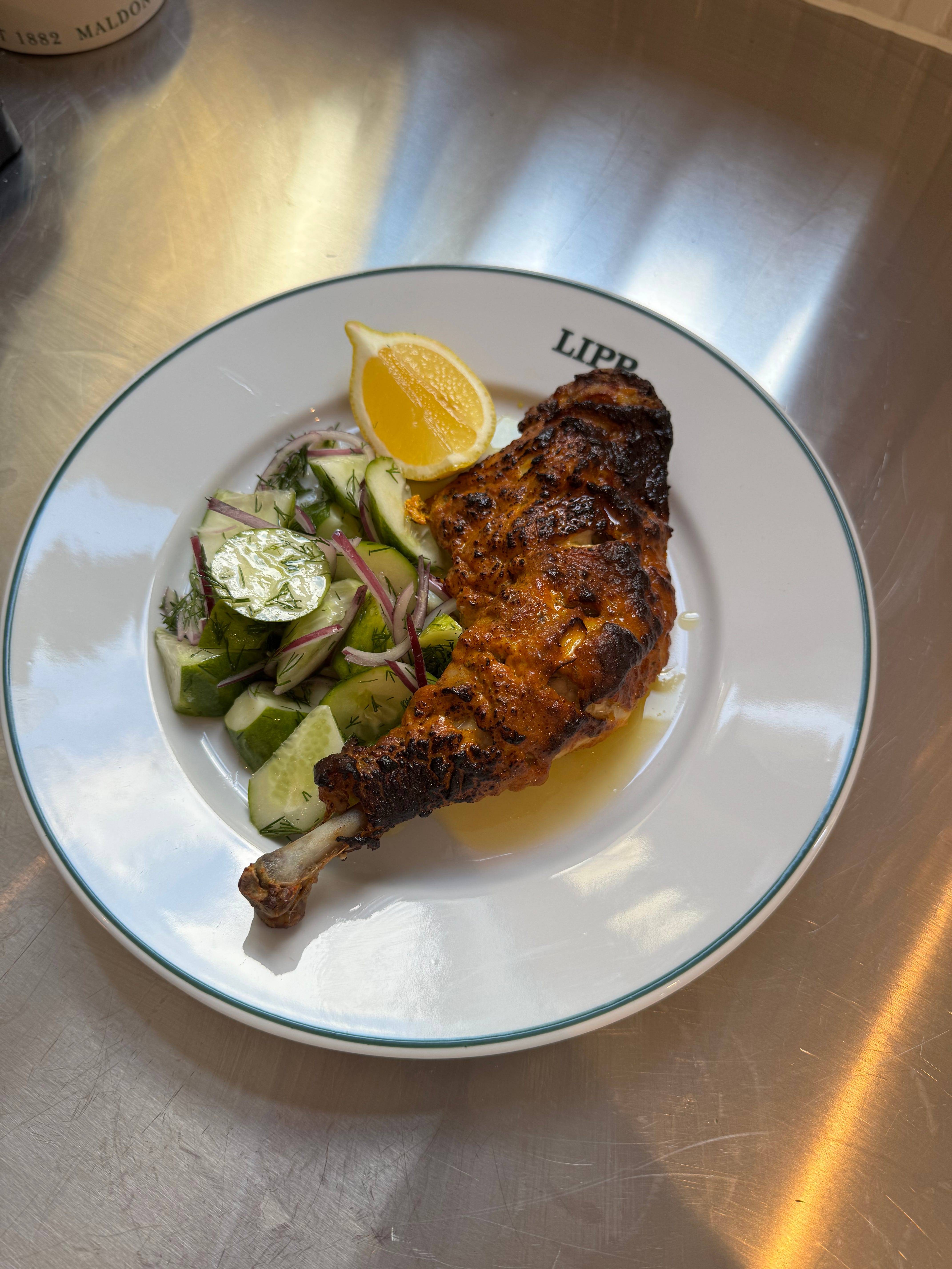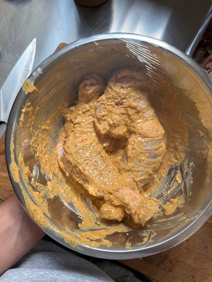 Once the legs are marinated, it’s time to cook. There are plenty of ways to roast a chicken leg, but my go to is the “hot and fast" followed by the “low and slow”. The two temperatures achieve two ends. The first portion of the cook is there to build as much maillard reaction on the chicken and yoghurt as possible. Once we’re happy with the colour, we drop the heat significantly. The lower temperature and time will transform the tough bite of the ‘just cooked’ muscles in the chicken into something approaching a braised texture. The legs will be juicy and tender, with 360° caramelised flavour on the outside. After a short rest, they’re ready to go.