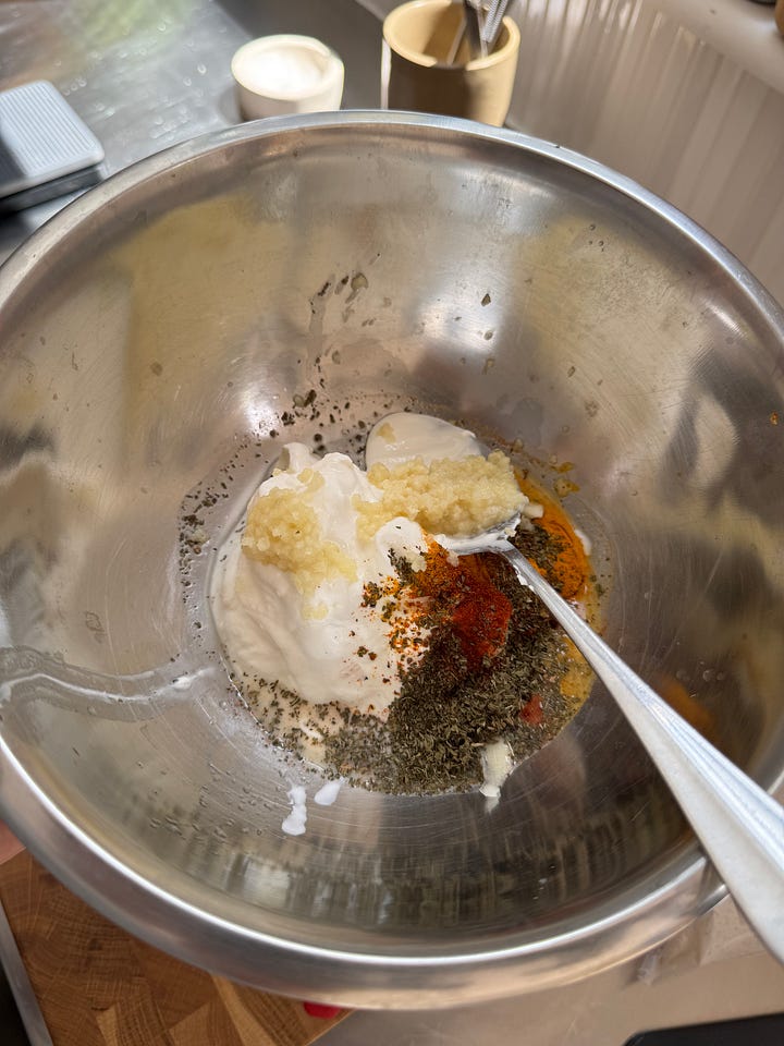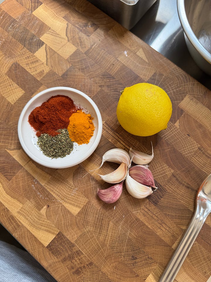 If you look at your yoghurt as a blank canvas, flavour-wise, you can lean into heaps of different directions. I’ve gone heavy on the garlic and lemon here with just a few supporting actors to bring the dish to life. I love the hum of dried mint and sweet smoked paprika is welcome regularly in my kitchen. Turmeric brings great colour and a subtle bitter character, too. This is a very garlic-forward recipe, so tweak at will. Fancy trying something completely different? Go nuts. You can blend herbs into your yoghurt, add grated ginger, orange zest, lime juice, grated apples or pears - anything goes. I’d avoid adding very large whole spices, they can burn in the oven and be unpleasant to eat. Coarsely crush at a minimum.