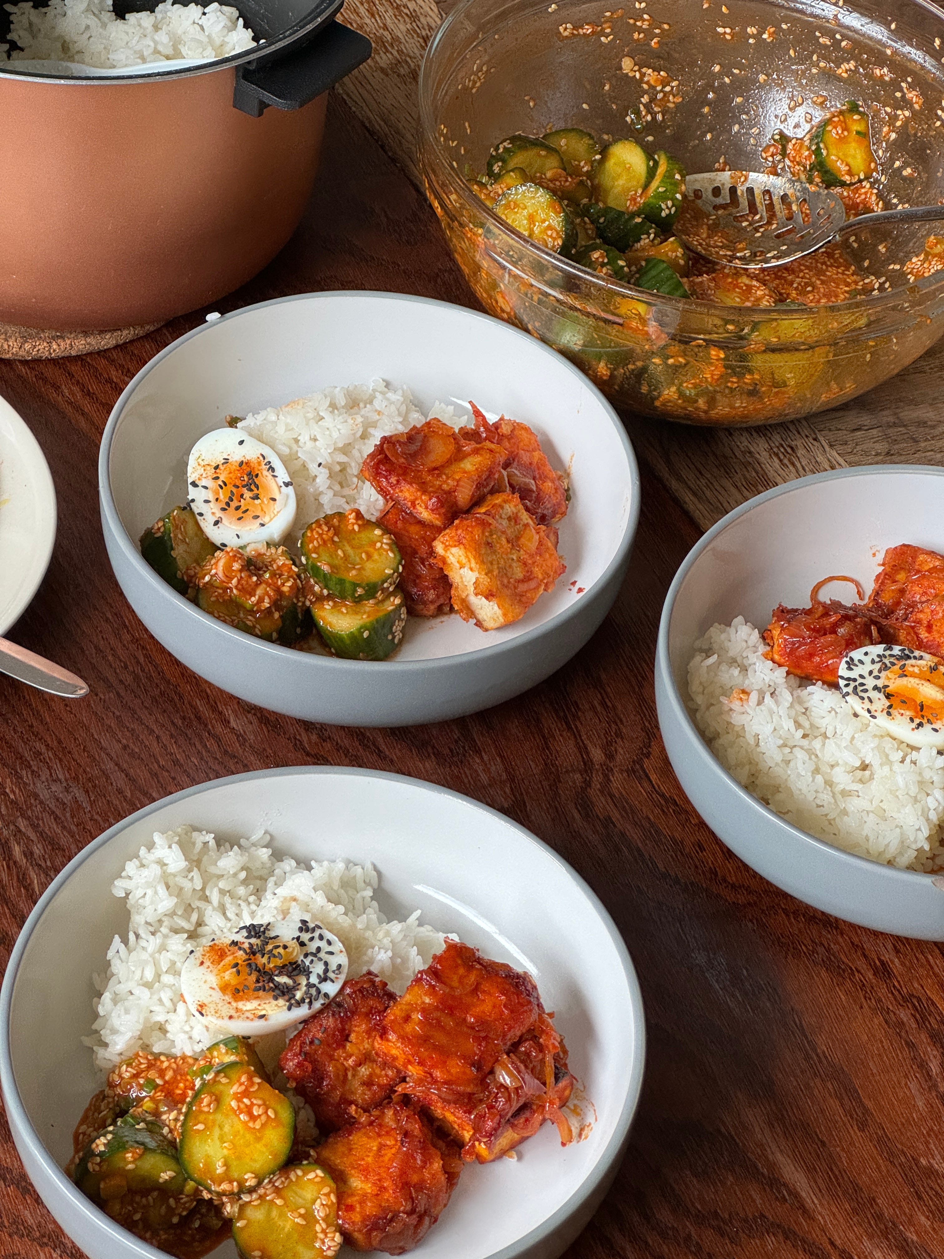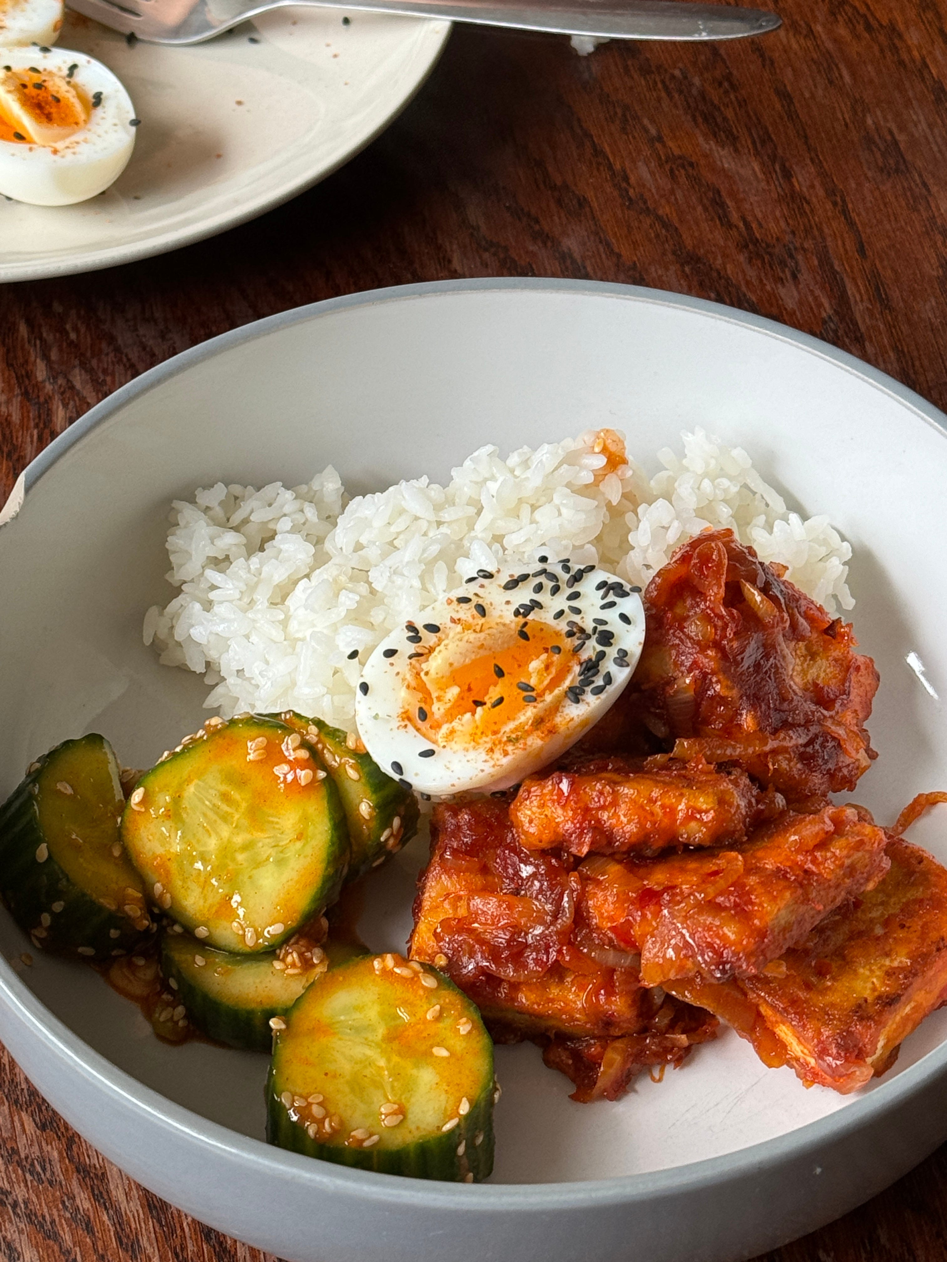 I am still convinced this shrimp sambal dish was nothing short of perfection, so I took notes and have attempted to recreate it for you here with tofu. It goes without saying that you can use a protein of your choice, I’m sure it would also do spectacular things to chicken or a good meaty white fish. I’ve added a few elements, the fudgy boiled eggs and gochujang sesame salad were the result of what I had to hand, and pair perfectly with the sticky tofu.