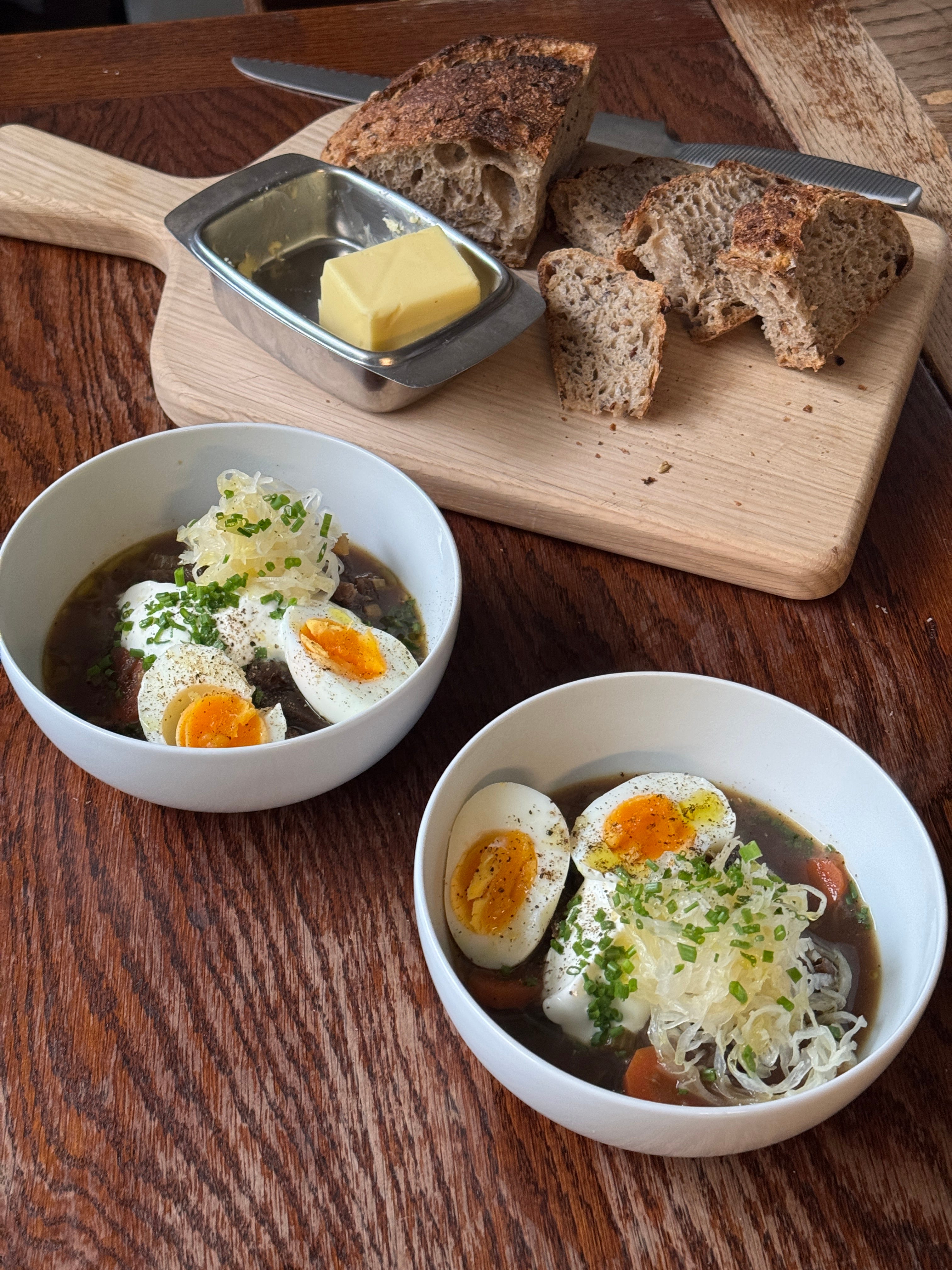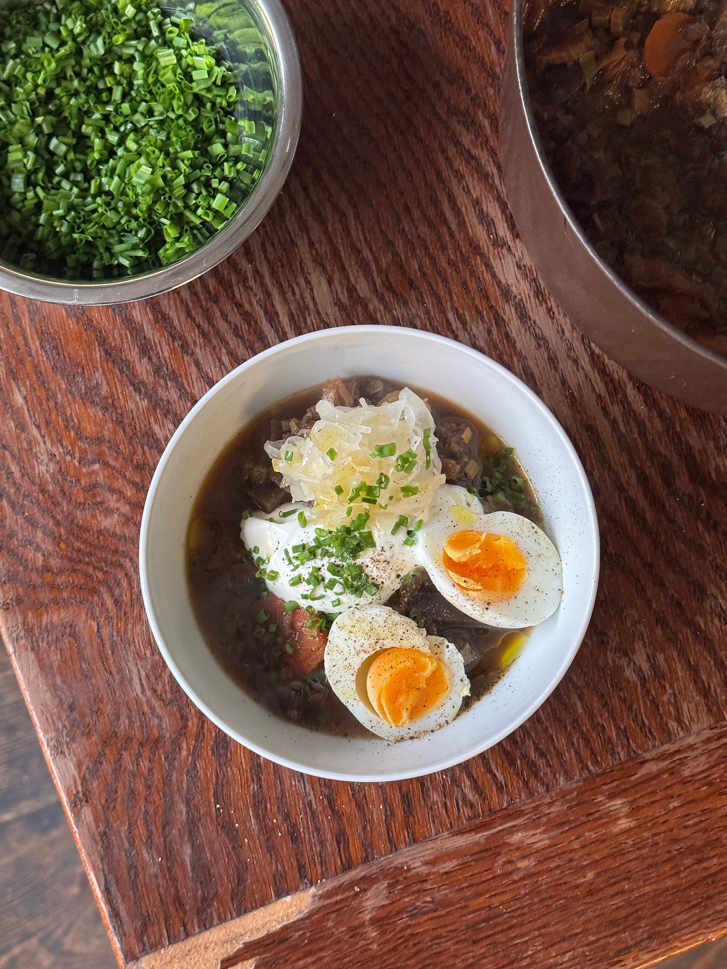 To serve: boiled eggs, Polish sour cream, sauerkraut, chopped chives and a good hunk of bread.