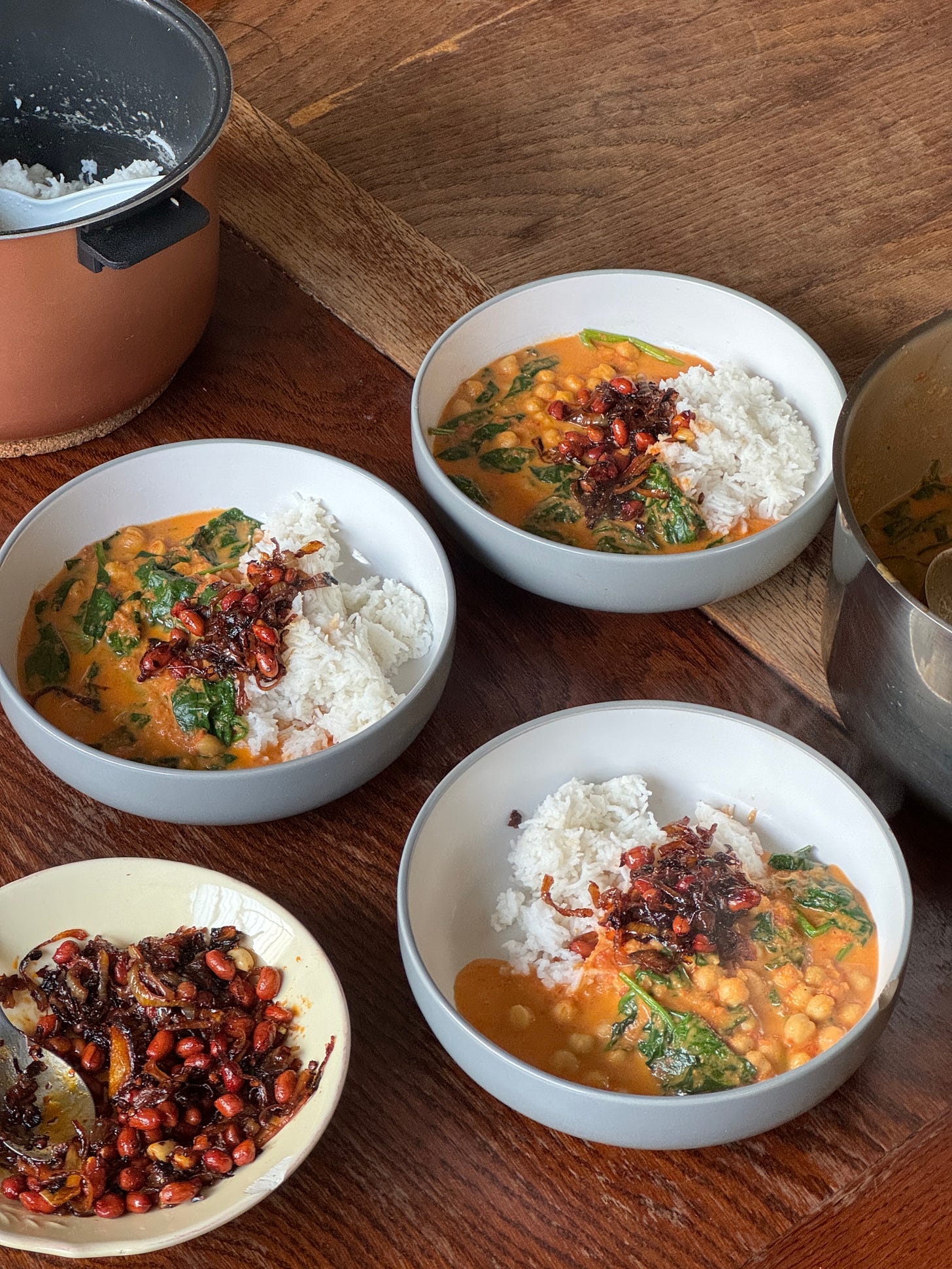 The first port of call is always to ask who is in for dinner, so I know how many I am cooking for and can consider all their needs. The next is to check out what we have in the house, depending on where we are in the week and how recently our food shop has been delivered, this can vary from an overflowing fridge to a barren pantry. On this day, we had lots in the way of tinned and dried goods, but not that many fresh ingredients, so I worked with what we had and made this curry up on the fly. It worked out really well and will now be something I lean on in busy and stressful times. It’s always good to have those recipes you can go back to, that are a comfort. A quick, healthy and easy route to a delicious dinner for all.