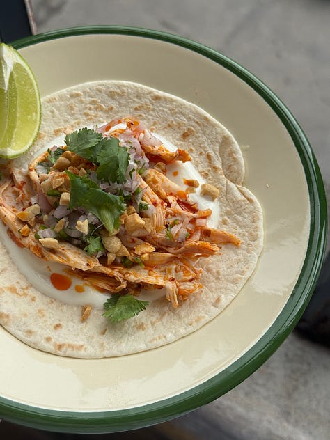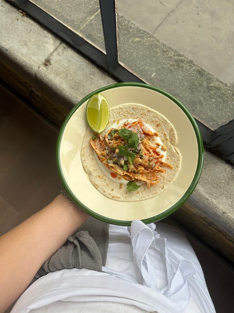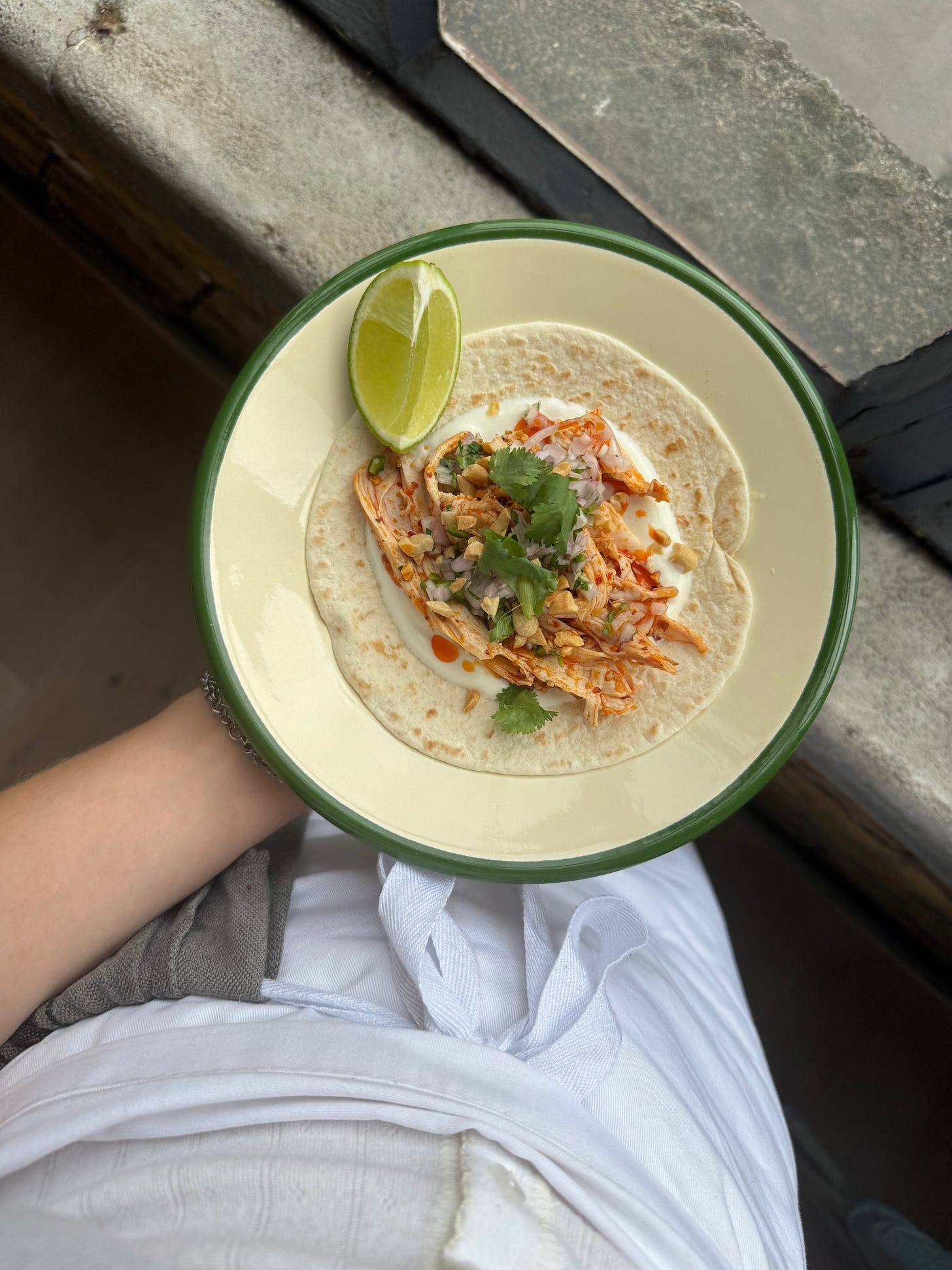 These tacos are simplicity incarnate, you can use any cooked protein for the filling, I just happen to think that leftover roast chicken is the best. Use your favourite chilli crisp oil here, or if you’re not a chilli oil fan (why not?!) you could substitute with hot sauce, harissa or chipotle mayo.