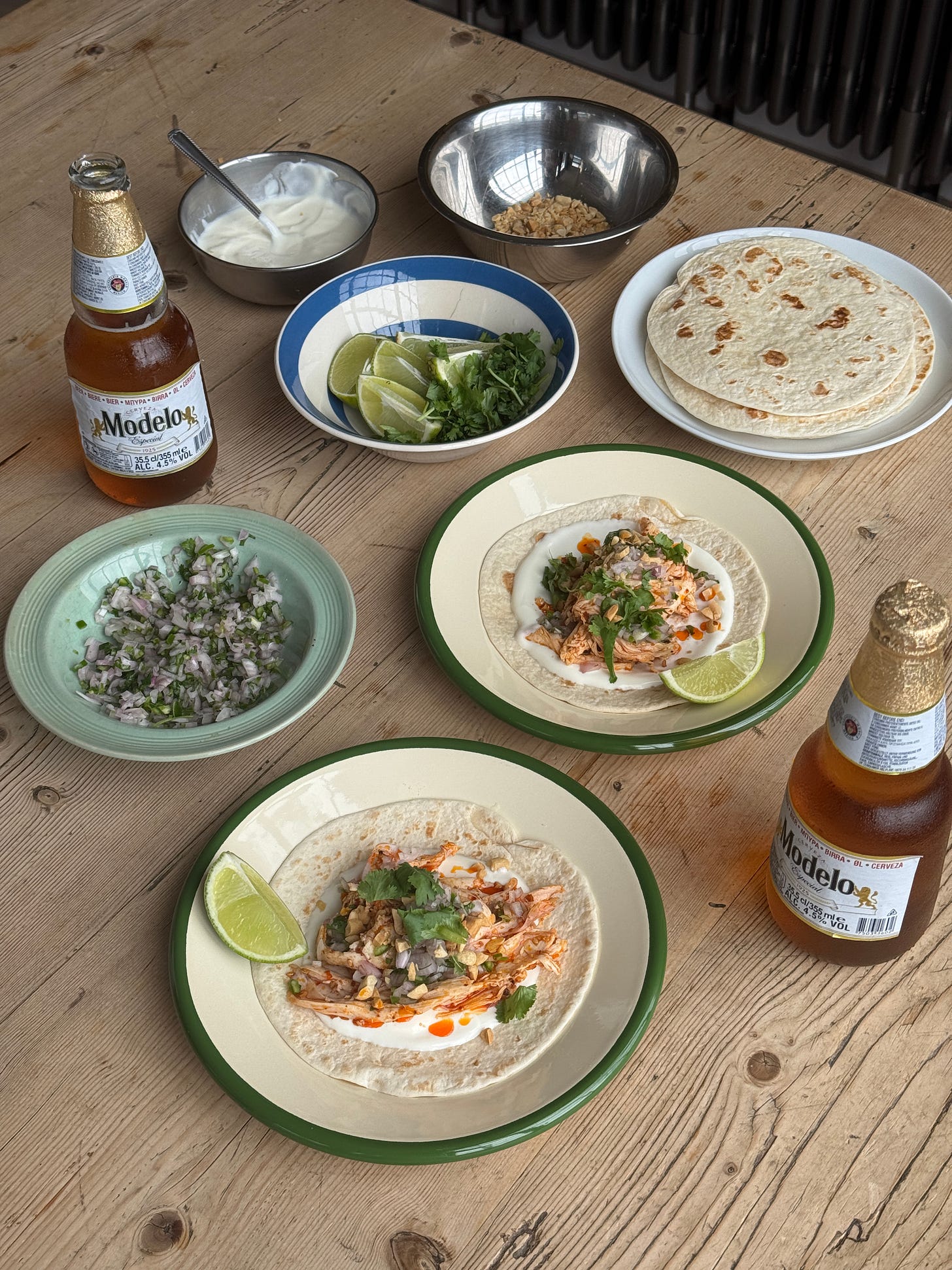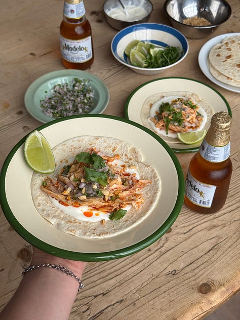 The key to having fun while cooking in the summer is really to just do less. Produce is at its best this time of year, the fruit is sweet, jammy and ripe, it needs very little doing to it, same goes for vegetables. And really if you’re cooking meat or fish, all you need to worry about is seasoning well and getting it good and charred. If you made my summer roast chicken recently, or you’re planning to, you may well have some leftover meat on the bird, and this is the best way to use it up. Really you can use any leftover meat or fish, with just a few simple ingredients you can have yourself a delicious taco party in under ten minutes. I love this kind of cooking, using up things you already have, making the most of your time and your energy, and rewarding yourself with a completely delicious meal.